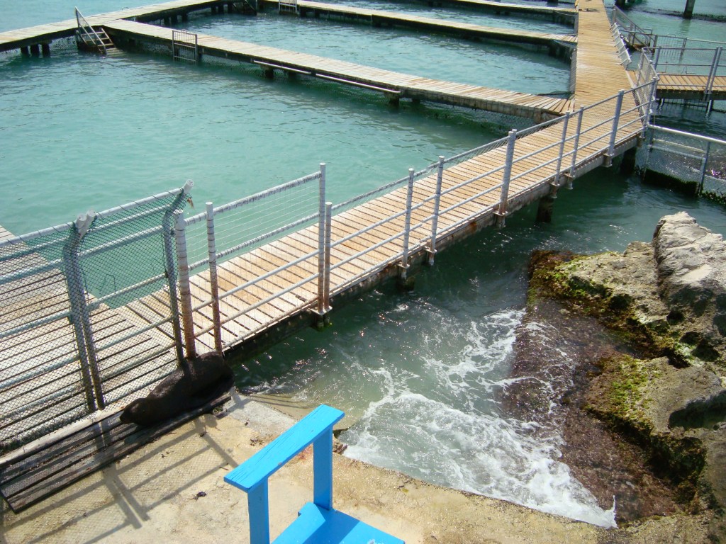 A solitary sealion crunches his body into a ball to fit into the tiny patch of shade in his wire-fenced compound. He has around 15 square metres of water, but he is about 1.5m long and likes to swim. No wonder he looks so miserable. He stares enviously at a pelican sitting on the fence, perhaps wondering what freedom would feel like. Dolphin Discovery is a sea life attraction on Isla Mujeres, just off the Yucatan peninsula in Mexico. A holiday paradise of white sand beaches, lush jungle, Mayan ruins and wildlife. The state of Quintana Roo currently has 19 facilities which house captive sea life.