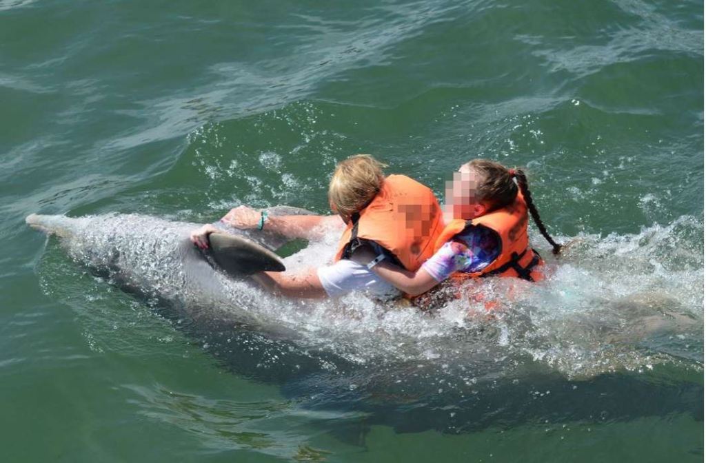 At 2.30pm a group of ten Americans amble down the wooden boardwalk and then down the steps into the dolphin pool, and the young trainers bring out cool boxes of fish. In return for fish, the dolphins dutifully begin their acrobatic display -somersaulting, backflipping and jumping to the cheers of the crowds. After “shaking hands” with tourists in the water, two tourists are given a signal to grab hold of the dolphin’s dorsal fin. The dolphin then begins to pull the men through the water. The tourists are smiling, over the moon with their ‘once in a lifetime experience’ after having been repeatedly told that “Dolphins are naturally inquisitive animals who enjoy interacting with you”. Each tourist in turn gets to manhandle the dolphins whilst the resident photographer snaps away. Holding their flippers, touching their noses, cradling the dolphins fully in their arms and even using the them as surfboards. After each encounter the dolphins are rewarded with fish.